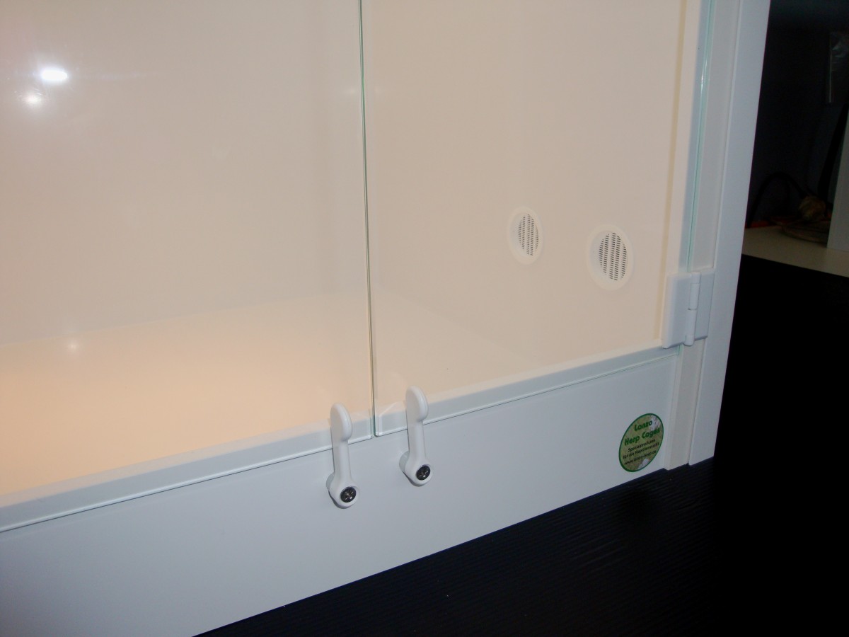 Diese Details haben uns bewogen, ein spezielles Terrarium zu kontruieren, welches durch eine Flügeltüre absolut dicht schließt und durch eine Edelstahlgaze-Decke von außen beleuchtet werden kann. Eine Vielzahl von Strahlern und Röhren können zum Einsatz kommen. Selbstverständlich bietet dieses Spezial-Terrarium auch einer Vielzahl anderer Arten optimale Bedingungen wie z.B. kleinen Anolis, anderen kletternden Geckos und Chamäleons. Die beiden Zuluftgitter in den Seitenwänden haben besonders feine Luftschlitze unter 1 mm. Als Zubehör bieten wir eine Abdeckhaube an, welche einen E27-Strahler aufnimmt und eine T5-Röhre 8W. Hier kann z.B. auch eine UV Sun T5 8W eingesetzt werden mit UV-Anteil! Gerne kann die Ausstattung auch nach besonderen Bedürfnissen variiert werden.